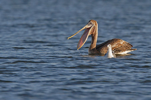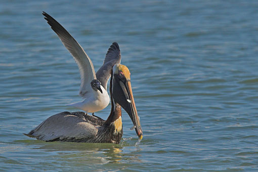 Florida / Pelikane #04Braunpelikan von Möve bedrängt -