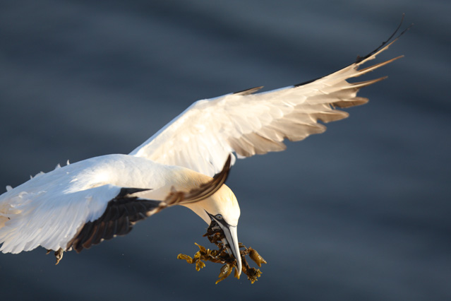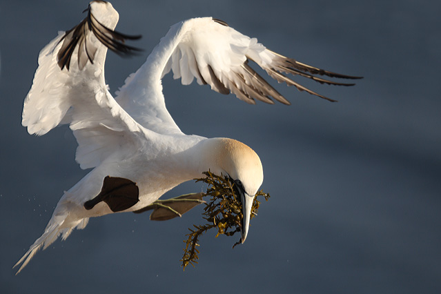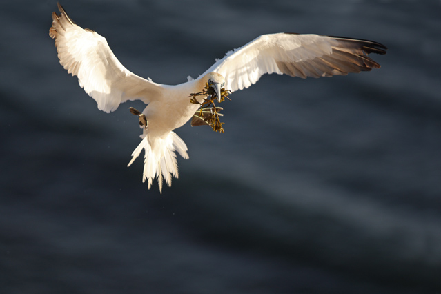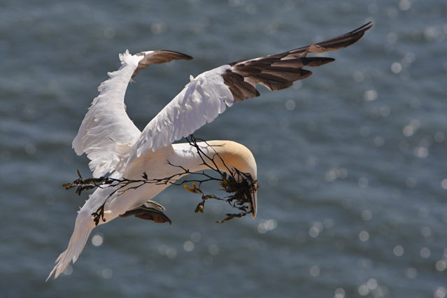 Vögel / Helgoland / Basstölpel Flug #03Basstölpel vor der Landung, mit Tang zum Nestbau -