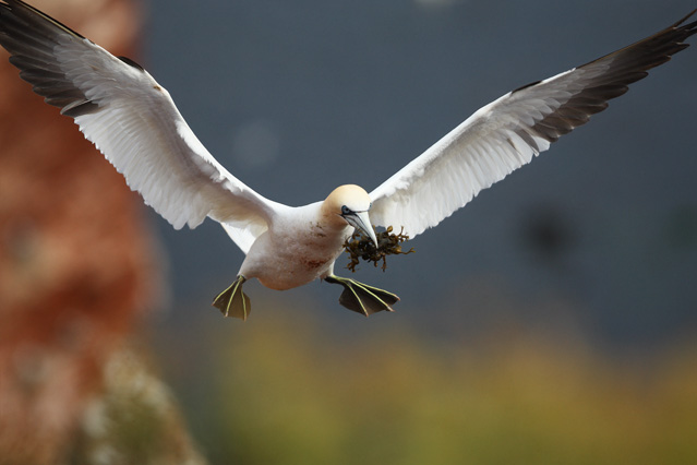 Vögel / Helgoland / Basstölpel Flug #12Basstölpel im Flug mit Tang zum Nestbau vor den Klippen