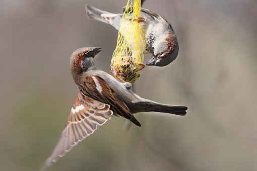 Vögel / vor der Haustür / Karlsruhe #07Sperlinge am Meisenknödel (Verhalten von den Meisen abgeschaut) -