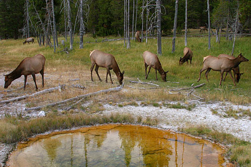 Wapitiherde an einem Geysir